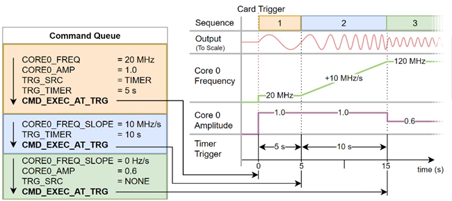 DDS 模式示例:只需幾條指令即可生成正弦波(橙色)、加速頻率(藍色)以及降低振幅(綠色)