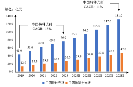 隨著新智造、新基建等新質生產力的發展,我國特種光纖市場需求保持快速增長態勢,市場規模不斷擴大。相關數據顯示,國內特種光纖市場規模從 2019 年的 43 億元增長至 2023 年的 76 億元,2028 年有望進一步攀升至 131 億元。