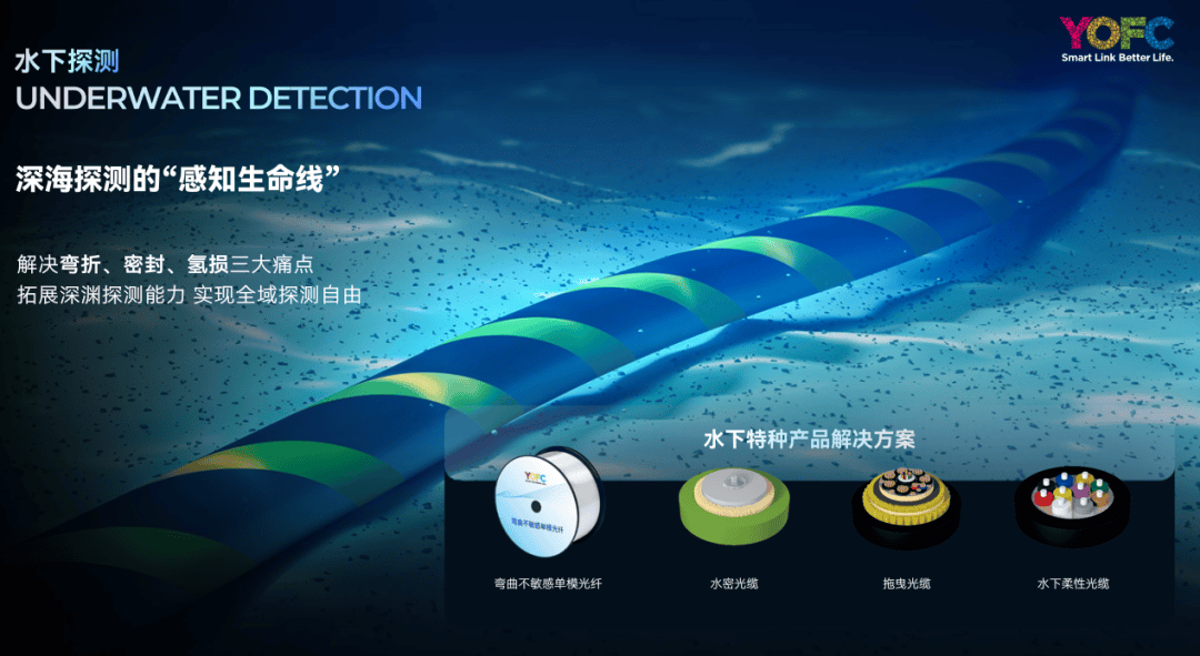 海:為了深度探索深海領域,長飛攻克了彎折、密封、氫損三大痛點,推出了水下特種產品解決方案(包括彎曲不敏感單模光纖、水密光纜、拖曳光纜、水下柔性光纜等特種產品),拓展深淵探測能力,實現全域探測自由。